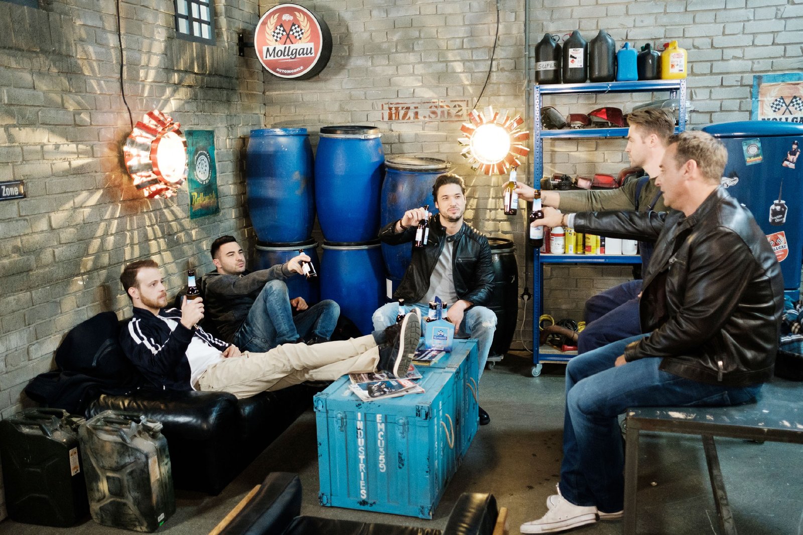 AlleingangJakob (Alexander Milo, M.) und Rufus (Kai Noll, r.) bekommen in ihrer Männerrunde Gesellschaft von Tobias (Patrick Müller, l.), Easy (Lars Steinhöfel, 2.v.l.) und Bambi (Benjamin Heinrich).Bild: © MG RTL D / Stefan Behrens