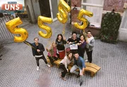 Glühende EifersuchtDie UNTER UNS-Schauspieler (stehend v.l.) Aaron Koszuta, Isabell Hertel, Tabea Heynig, Luca Maric, Petra Blossey, Cronis Karakassidis, (vorne) Claudelle Deckert und Milos Vukovic feiern die 5.555 Folge UNTER UNS.Bild: © RTL