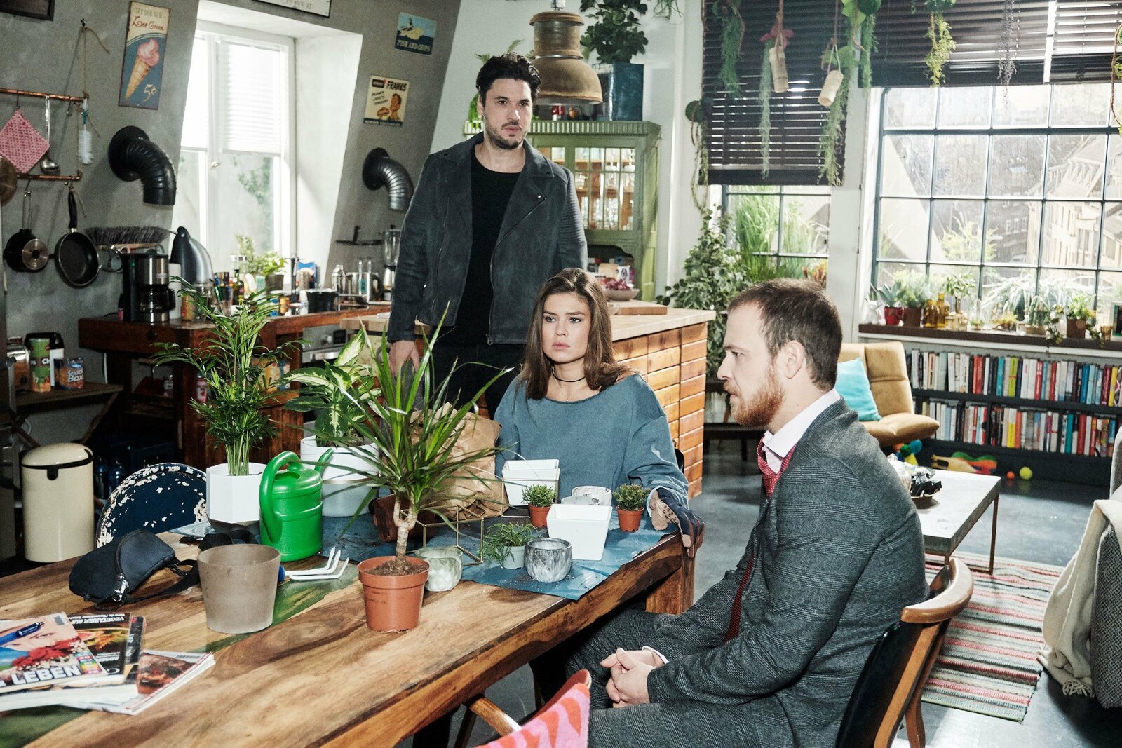 Saskia muss wieder in der Konditorei arbeitenVivien (Sharon Berlinghoff) und Tobias (Patrick Müller, r.) erfahren ernüchtert, dass Sebastian ein Alibi für die Tatzeit hat. Hinten Jakob (Alexander Milo)Bild: © RTL