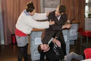 Plötzlicher ZusammenbruchMalte (Stefan Bockelmann, l.) springt Rufus (Kai Noll) bei, als der vor einer Kundin Marita Bruhns (Katja Mitchell) in Bedrängnis gerät.Bild: © RTL / Stefan Behrens