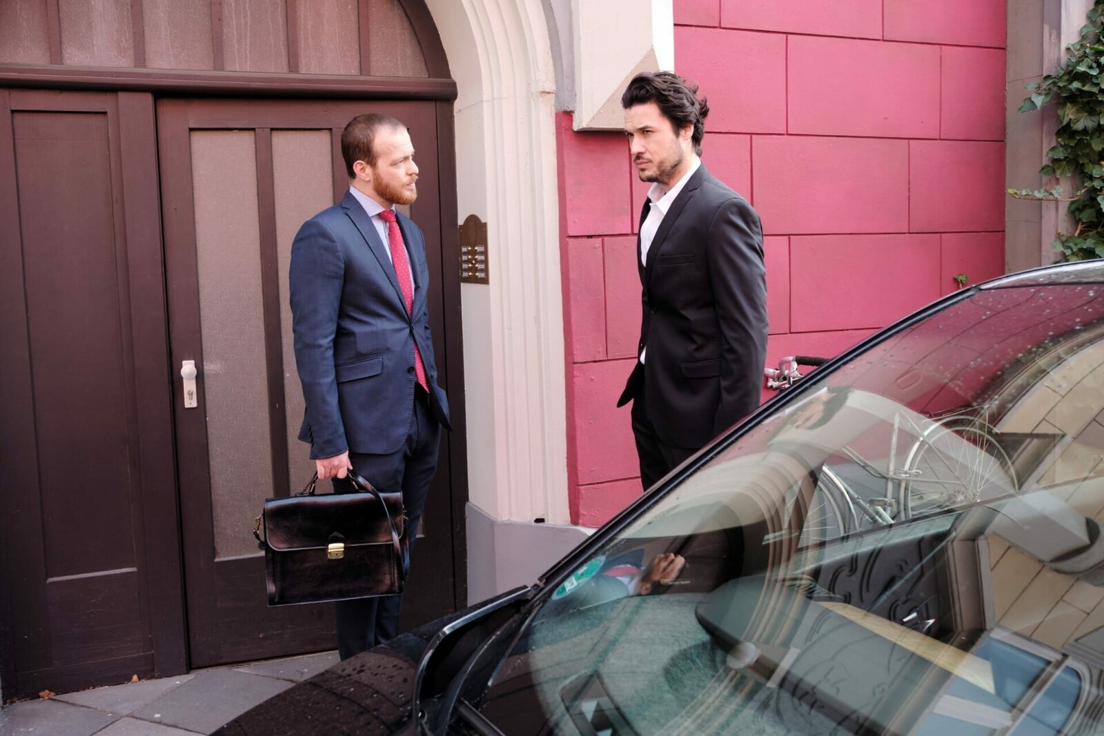 Jakobs Undercover-Einsatz läuft aus dem RuderJakob (Alexander Milo, r.) versichert Tobias (Patrick Müller), die Gefahr seiner Undercover-Ermittlung im Griff zu haben.Bild: © TVNOW / Stefan Behrens