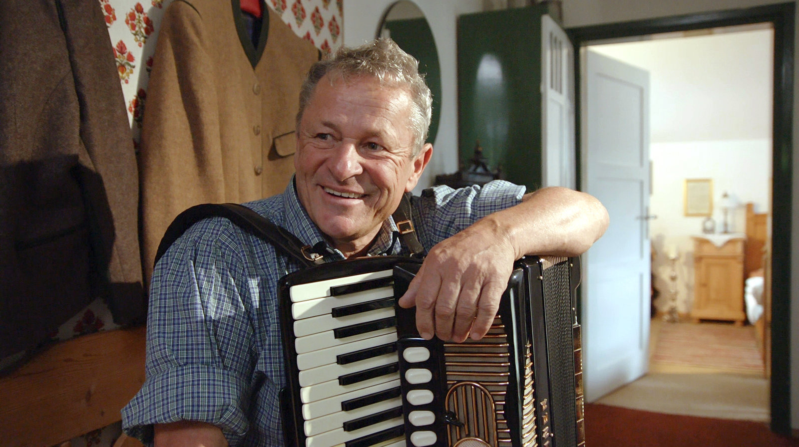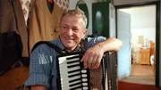 Erich Gawlik spielt gern im Treppenhaus auf seinem Akkordeon.Bild: © BR/Arnd Frenger/Daniel Delbeck