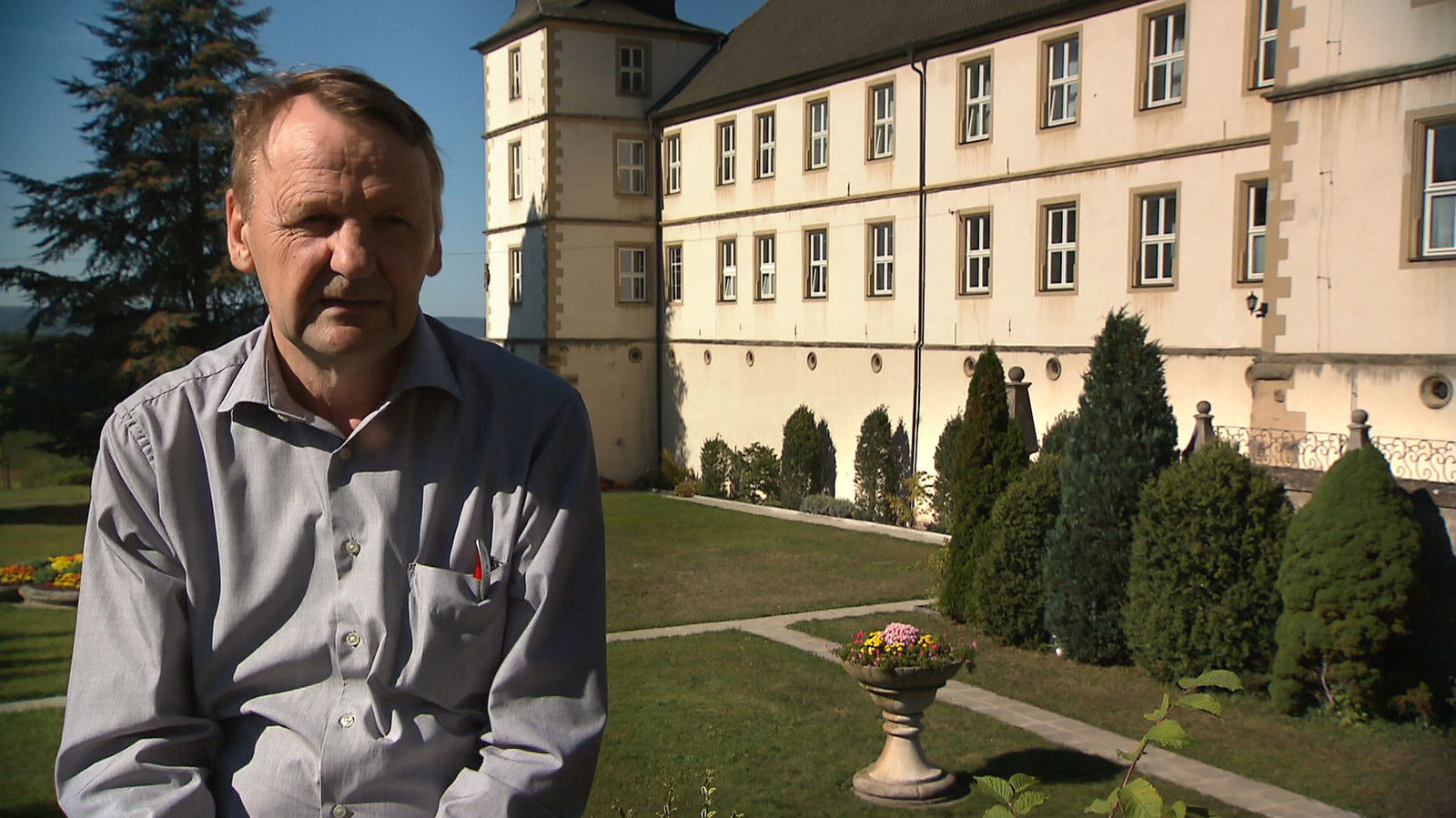 Kreisheimatpfleger Reinhold Albert vor dem Barockschloss in Sternberg.Bild: © BR/Volker Gabriel