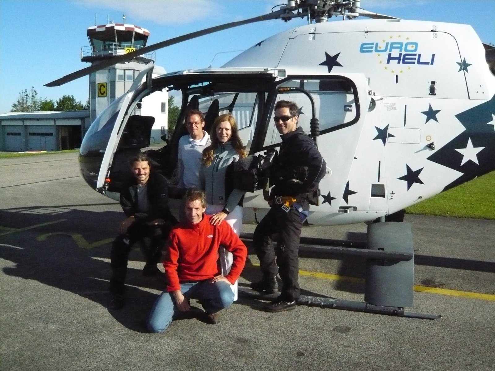 Hüben und drüben - Geschichten von der ZonengrenzeAnnette Hopfenmüller und ihr Team Marc Gensel, Markus Magerer, der Hubschrauberpilot und Kameramann Martin Rösner bei den Dreharbeiten (von links).Bild: © BR/Markus Mager