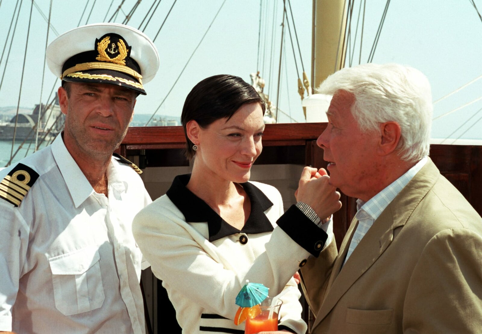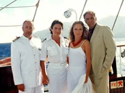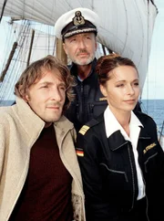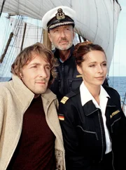 Liebe unter weißen SegelnDer Journalist Thomas Sand (Mark Keller, li.) schreibt eine Reisereportage über das Segel-Schulschiff von Kapitän Gregor Simonis (Miguel Herz-Kestranek, Mitte), auf dem Gregors Geliebte Dr. Karen Stendal (Christina Plate) als Schiffsärztin arbeitet.Bild: © ARD Degeto