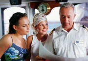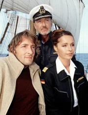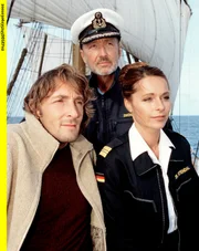 Liebe unter weißen SegelnDer Journalist Thomas Sand (Mark Keller, li.) schreibt eine Reisereportage über das Segel-Schulschiff von Kapitän Gregor Simonis (Miguel Herz-Kestranek, Mitte), auf dem Gregors Geliebte Dr. Karen Stendal (Christina Plate) als Schiffsärztin arbeitet.Bild: © ARD Degeto