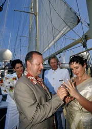 Träume am HorizontKapitän Jensen (Horst Janson, 2.v.re.) traut das Paar Karl (Martin Weinek) und Beate (Sanne Schnapp, re.). Cruisedirektorin Saskia (Gerit Kling) ist Trauzeugin.Bild: © ARD Degeto/Mike Gast
