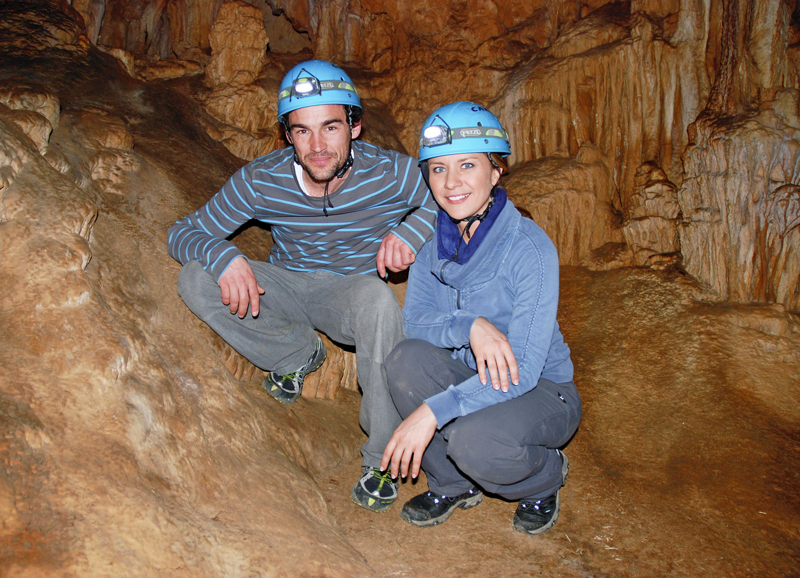 MallorcaBergführer Juan Angel mit Moderatorin Wasiliki Goutziomitros in einer TropfsteinhöhleBild: © ZDF und SF