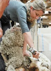 Neuseeland - Maoris, Natur und RugbyModeratorin Wasiliki Goutziomitros beim SchafescherenBild: © ZDF und SRF/BENI LEONI