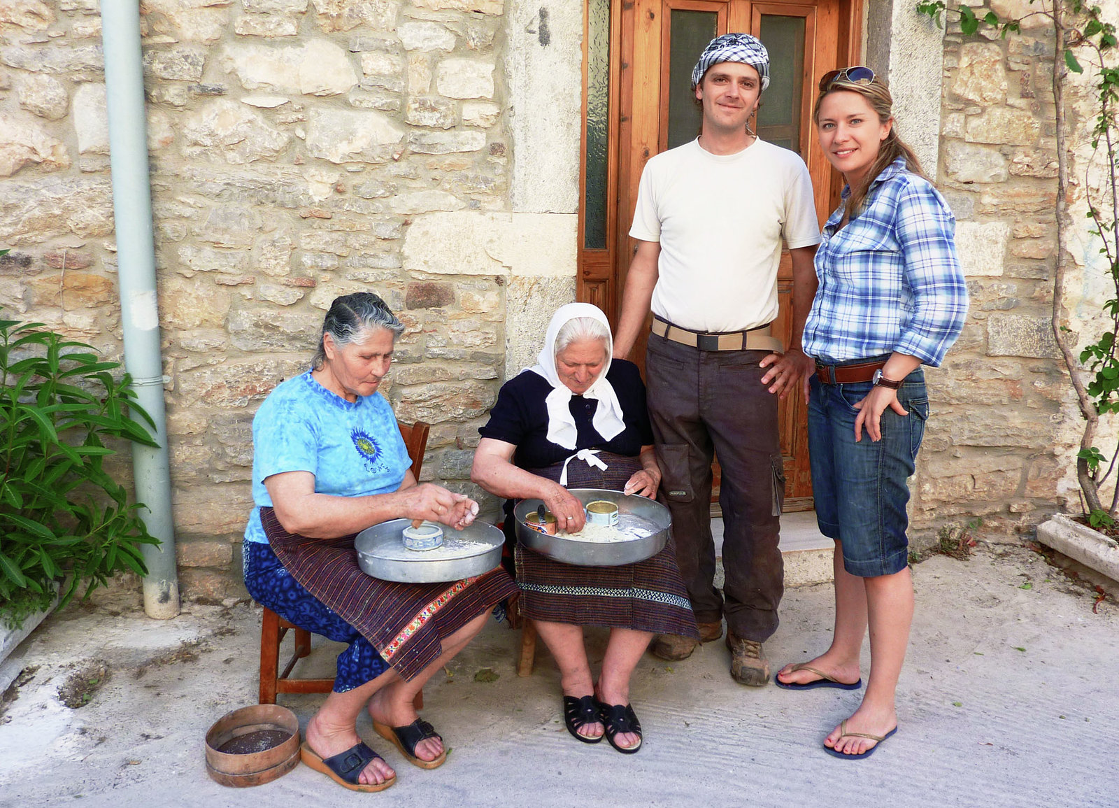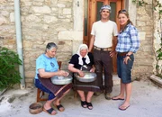Griechenland - Antike, Moderne und GastfreundschaftModeratorin Wasiliki Goutziomitros (r.) mit Mastixbauer Wasillis Ballas (2.v.r.)Bild: © ZDF und SRF
