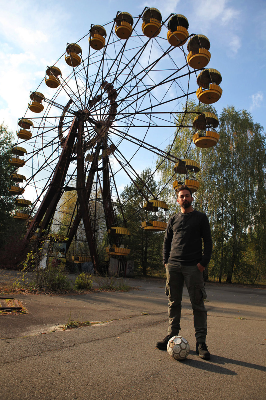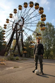 Ein Metall verändert die WeltDr. Derek Muller vor dem Riesenrad der Geisterstadt Prypjat. Die Stadt wurde 1986 infolge des Reaktorunglücks in Tschernobyl geräumt, ist mittlerweile aber für Touristen zugänglich.Bild: © ZDF / © Josephine Wright/Genepool Productions Pty Ltd