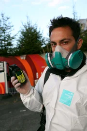Ein Metall verändert die WeltAusgerüstet mit Schutzkleidung und Geigerzähler besucht Dr. Derek Muller das kontaminierte Gebiet in Fukushima.Bild: © ZDF / © Josephine Wright/Genepool Productions Pty Ltd