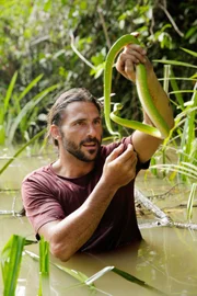 Im Land der KannibalenHazen mit einer grünen Baumpython.Bild: © TVNOW / © 2016 National Ge