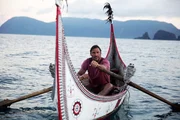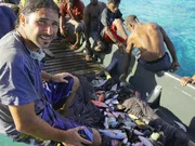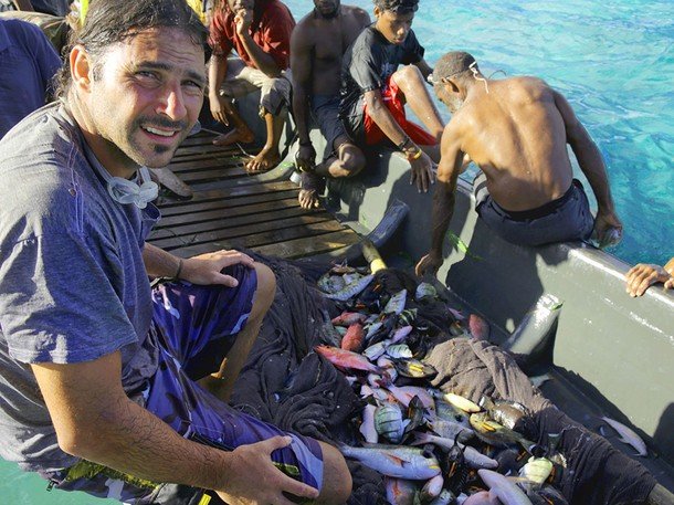 Hai-Jäger der SalomonenHazen sitting in a boat full of fish. Amazingly, the fish within the ring back away from the vine. Its not a physical barrier, but the combination of rustling, kicking, and thrasing.Bild: © Photograph by National Geographic Channels/Samantha Tollworthy