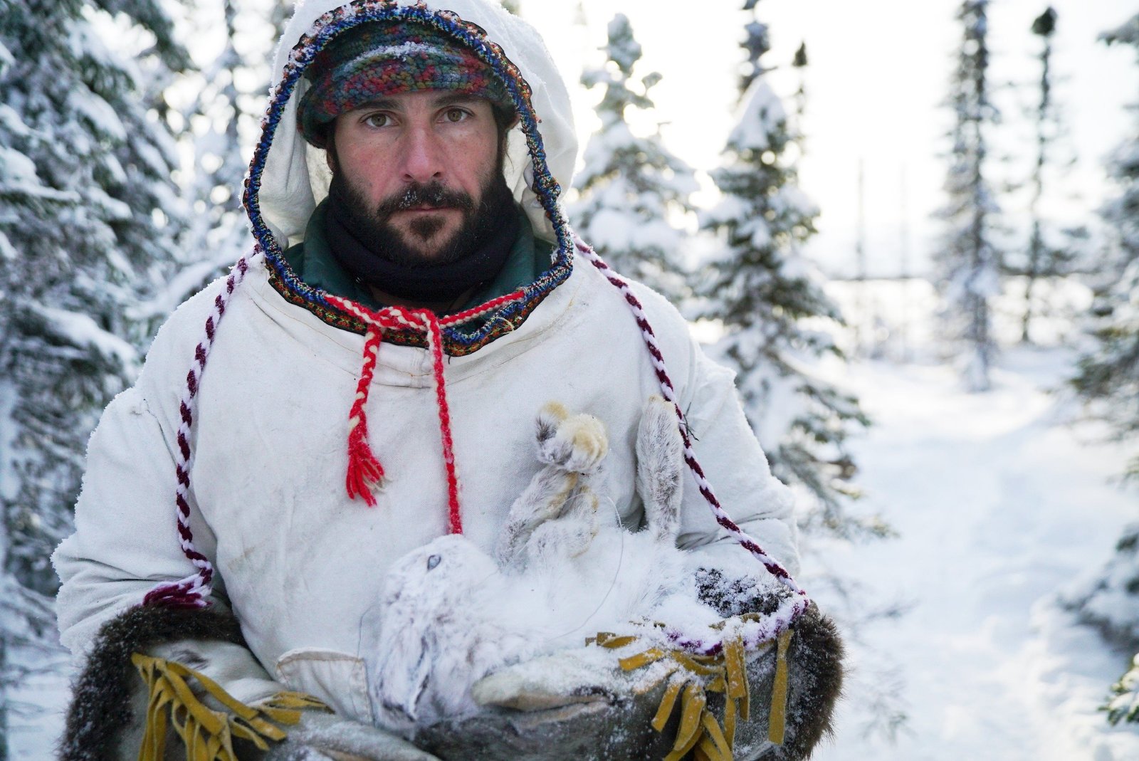 Im Land der KaribusHazen mit einem toten Schneehasen, der in einer Falle gefangen wurde.Bild: © TVNOW / © 2017 National Ge