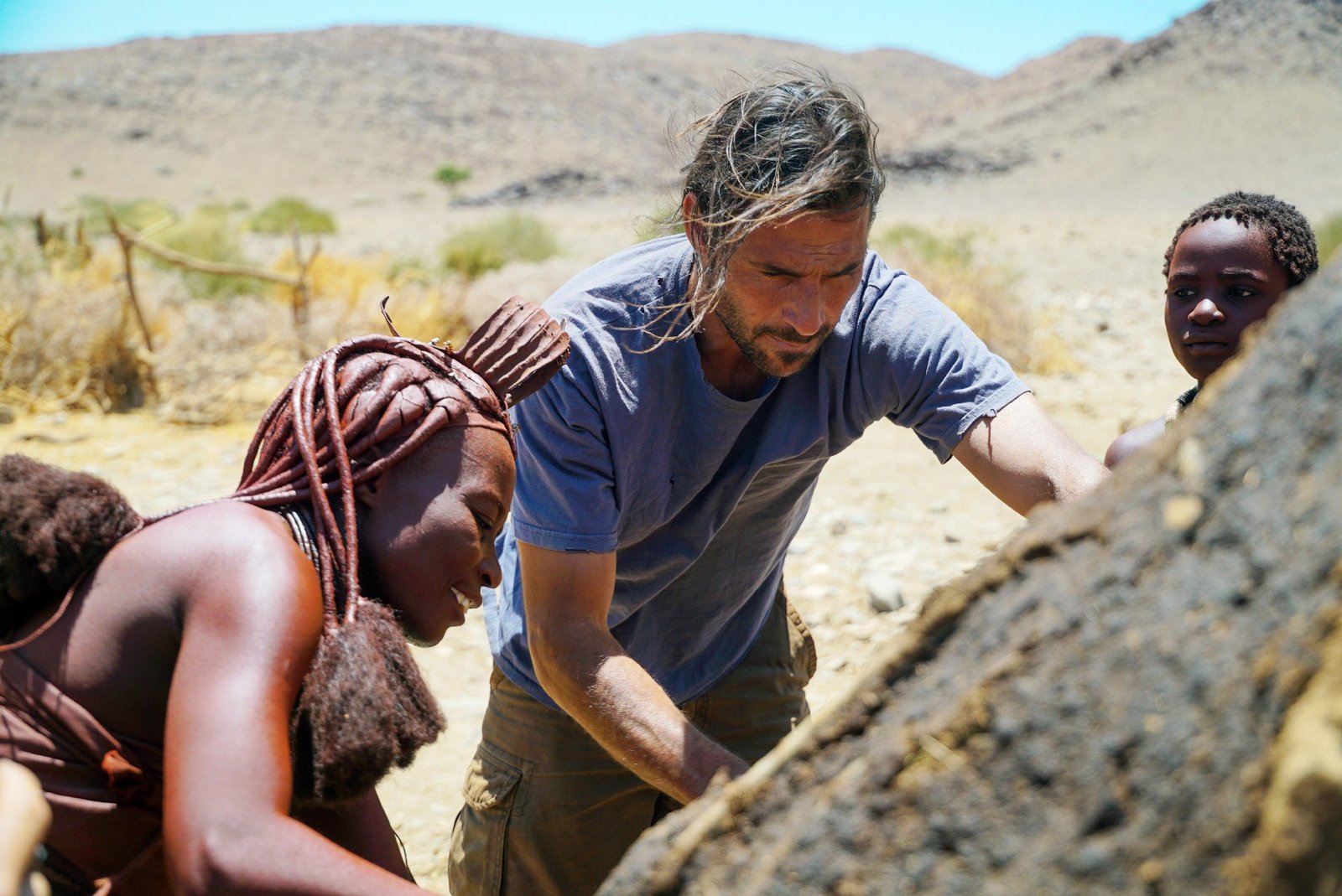 Unter der Sonne NamibiasDer Himbastamm hat Hazen (M.) gelehrt, wie man in der Wüste überlebt.Bild: © TVNOW / © 2017 National Ge