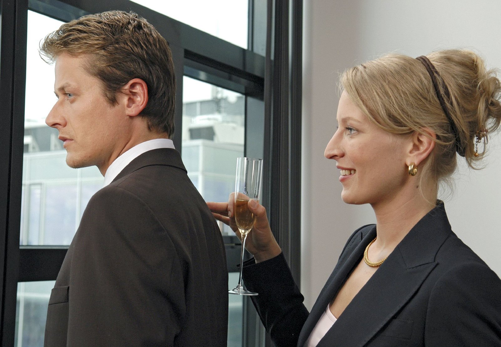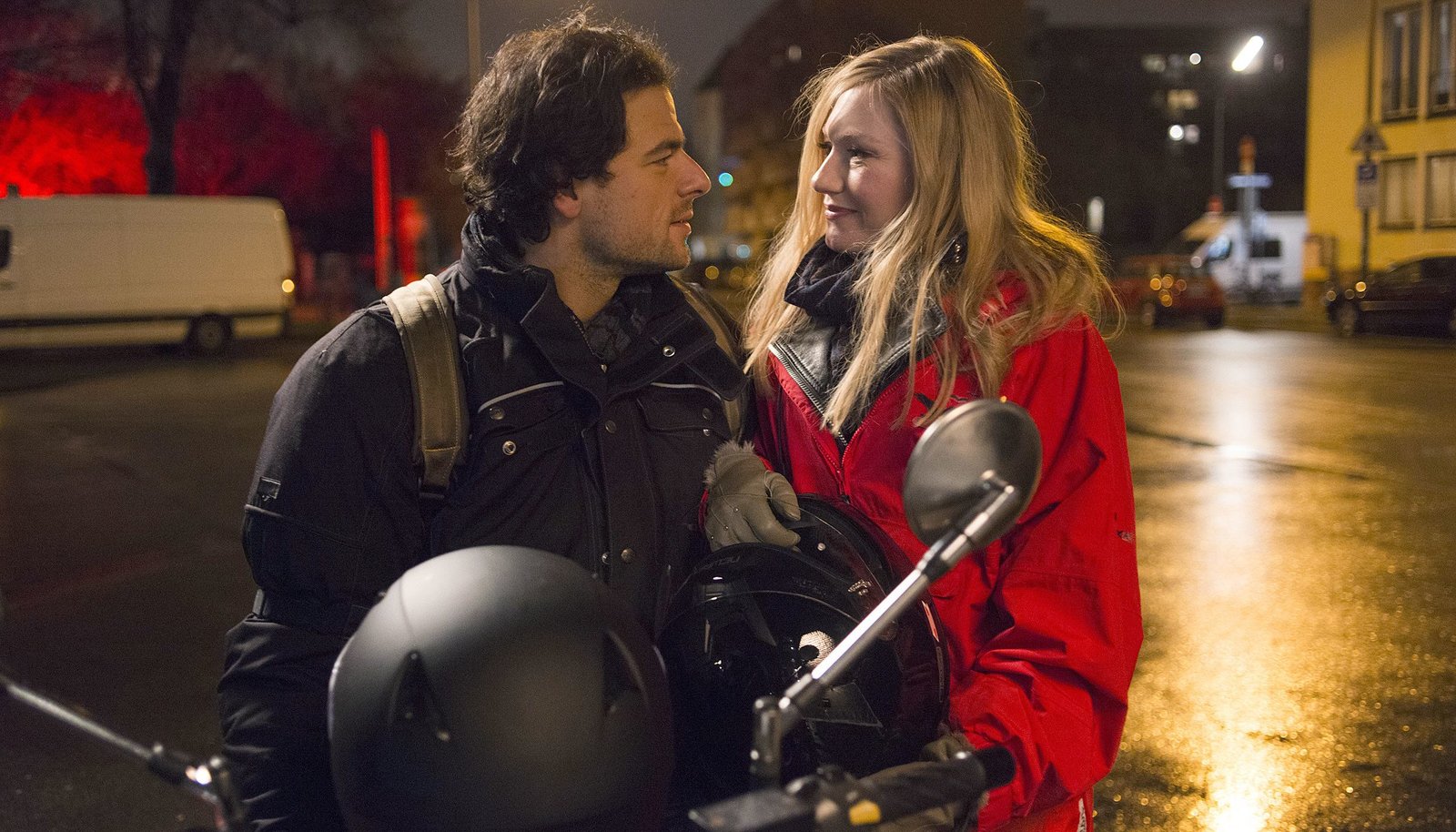 Lügen haben schöne BeineKathrin (Johanna Christine Gehlen) weiß, dass Andi (Tobias Licht) kein Anwalt ist – er ist noch ahnungslos.Bild: © NDR/Degeto/Marco Meenen