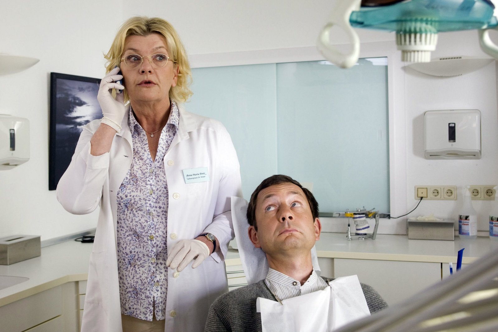 Wer küsst den Doc?ARD UTTA DANELLA - WER KÜSST DEN DOC?, Deutschland 2013, Regie John Delbridge, am Freitag (26.04.13) um 20:15 Uhr im Ersten. Mitten in der Behandlung des Standesbemanten Kratzler (Anton Figl) erhält Anna Maria (Saskia Vester) einen wichtigen Anruf.Bild: © ARD Degeto/Erika Hauri