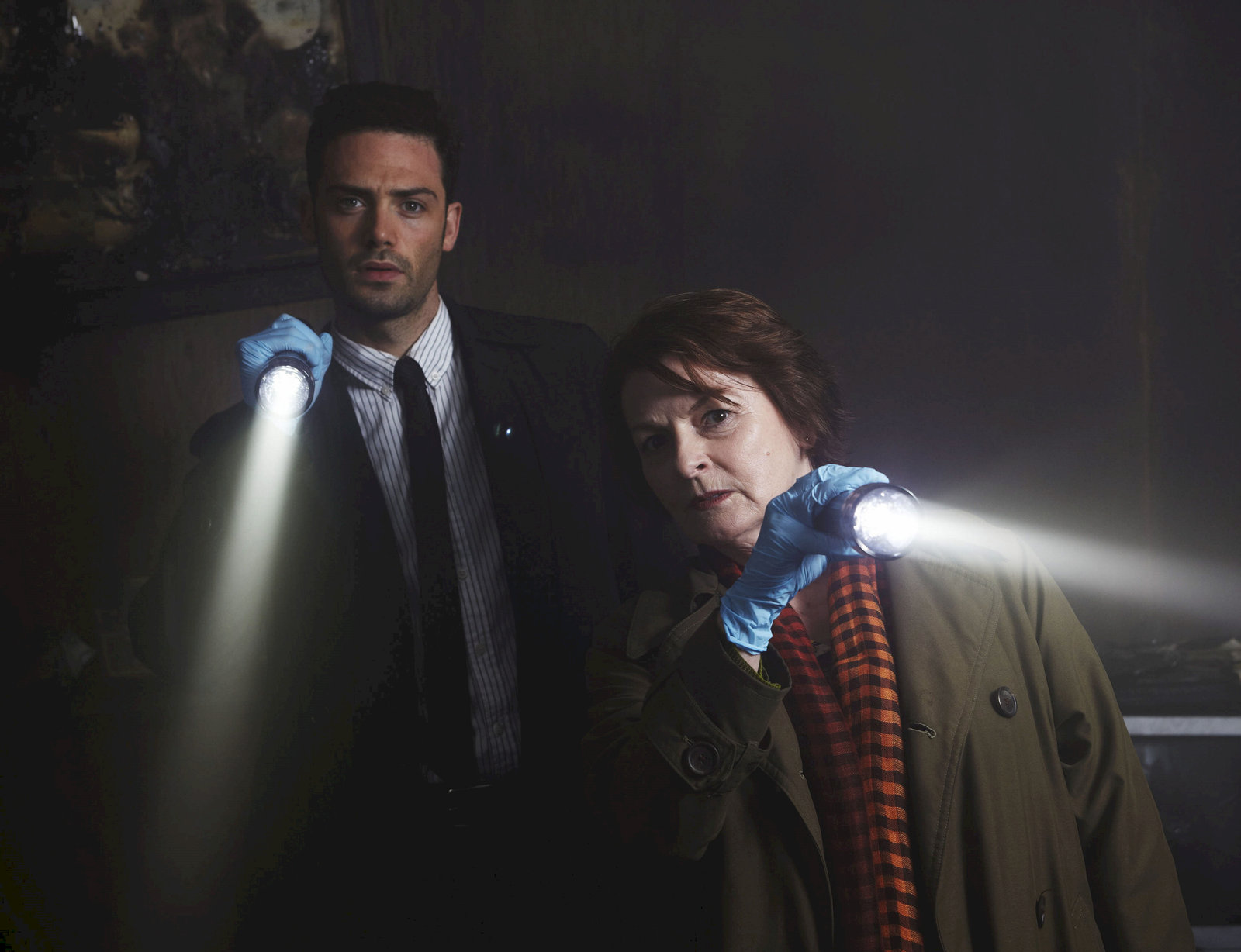 PhantomschmerzDS Joe Ashworth (David Leon, l.) und DCI Vera Stanhope (Brenda Blethyn, r.) versuchen den Ursachen des Brands in Stuart Mackens Haus auf den Grund zu kommen.Bild: © ZDF und Helen Turton