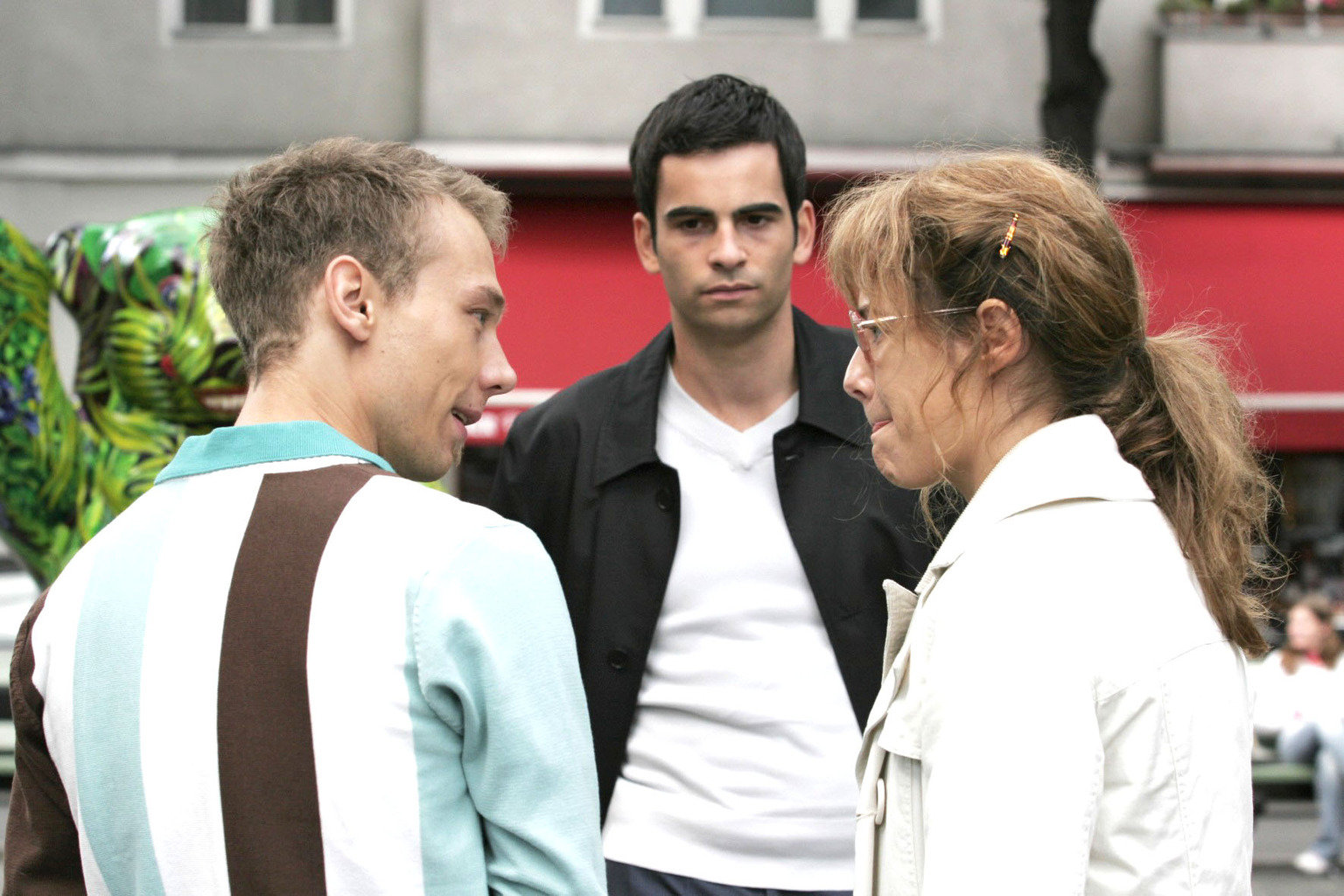 Entschuldigung abgelehnt?Als Lisa (Alexandra Neldel, r.) empört Richards Wohnung verlässt, trifft sie nicht ganz zufällig auf Jürgen (Oliver Bokern, l.) und David (Mathis Künzler, M.). - (Dieses Foto von Alexandra Neldel darf nur in Zusammenhang mit der Berichterstattung über die Serie "Verliebt in Berlin" veröffentlicht und verbreitet werden.)Bild: © Sat.1 Eigenproduktionsbild frei