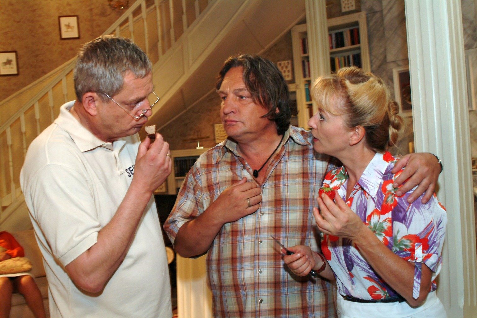 Was Männer wollenHelga (Ulrike Mai, r.) und Bernd (Volker Herold, M.) fühlen sich ein bisschen überrumpelt, als Friedrich (Wilhelm Manske, l.) vorschlägt, dass sie als "Team Plenske" an dem Crocket-Spiel teilnehmen sollen.Bild: © Sat.1 Eigenproduktionsbild frei