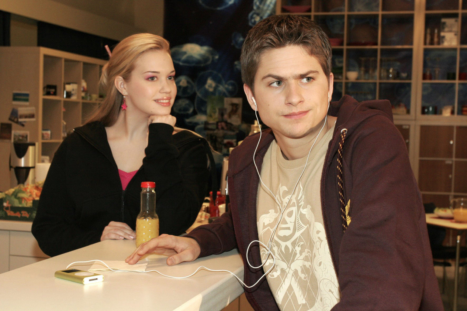 RendezvousBruno (Tim Sander, r.) ist überglücklich, als Kim (Lara-Isabelle Rentinck, l.) endlich seine Einladung zu einem Rendezvous annimmt.Bild: © Sat.1 Eigenproduktionsbild frei