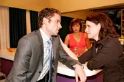 Land unterYvonne (Bärbel Schleker, M.) versucht Max (Alexander Sternberg, l.) seit Tagen zu sprechen, doch er hat scheinbar mit seiner neuen Assistentin Inka (Stefanie Höner, r.) Wichtiges zu besprechen.Bild: © Sat.1 Eigenproduktionsbild frei