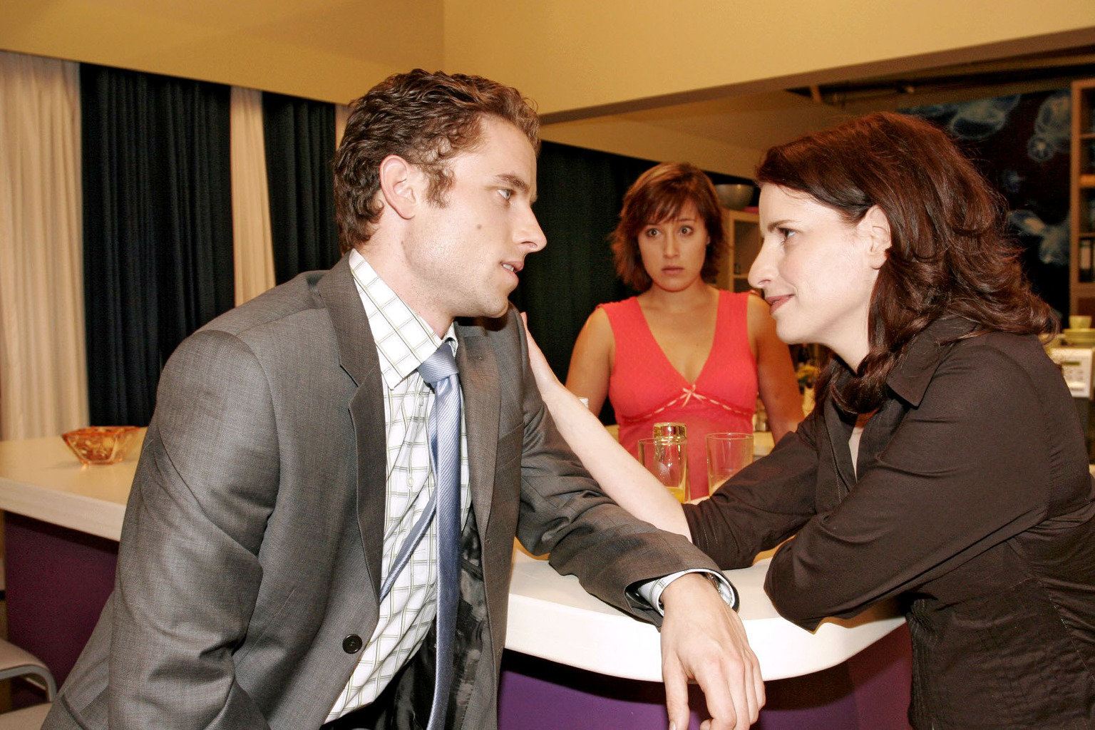 Mitleid für YvonneLisa (Alexandra Neldel, M.) bekommt mit, wie Richard (Karim Köster, r.) gegenüber Mariella (Bianca Hein, l.) seinem Ärger Luft macht. (Dieses Foto von Alexandra Neldel darf nur in Zusammenhang mit der Berichterstattung über die Serie "Verliebt in Berlin" veröffentlicht und verbreitet werden.)Bild: © Sat.1 Eigenproduktionsbild frei