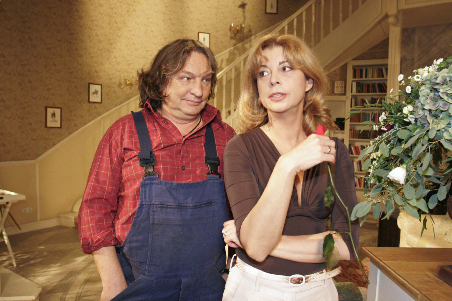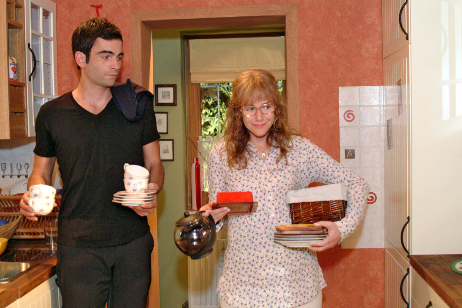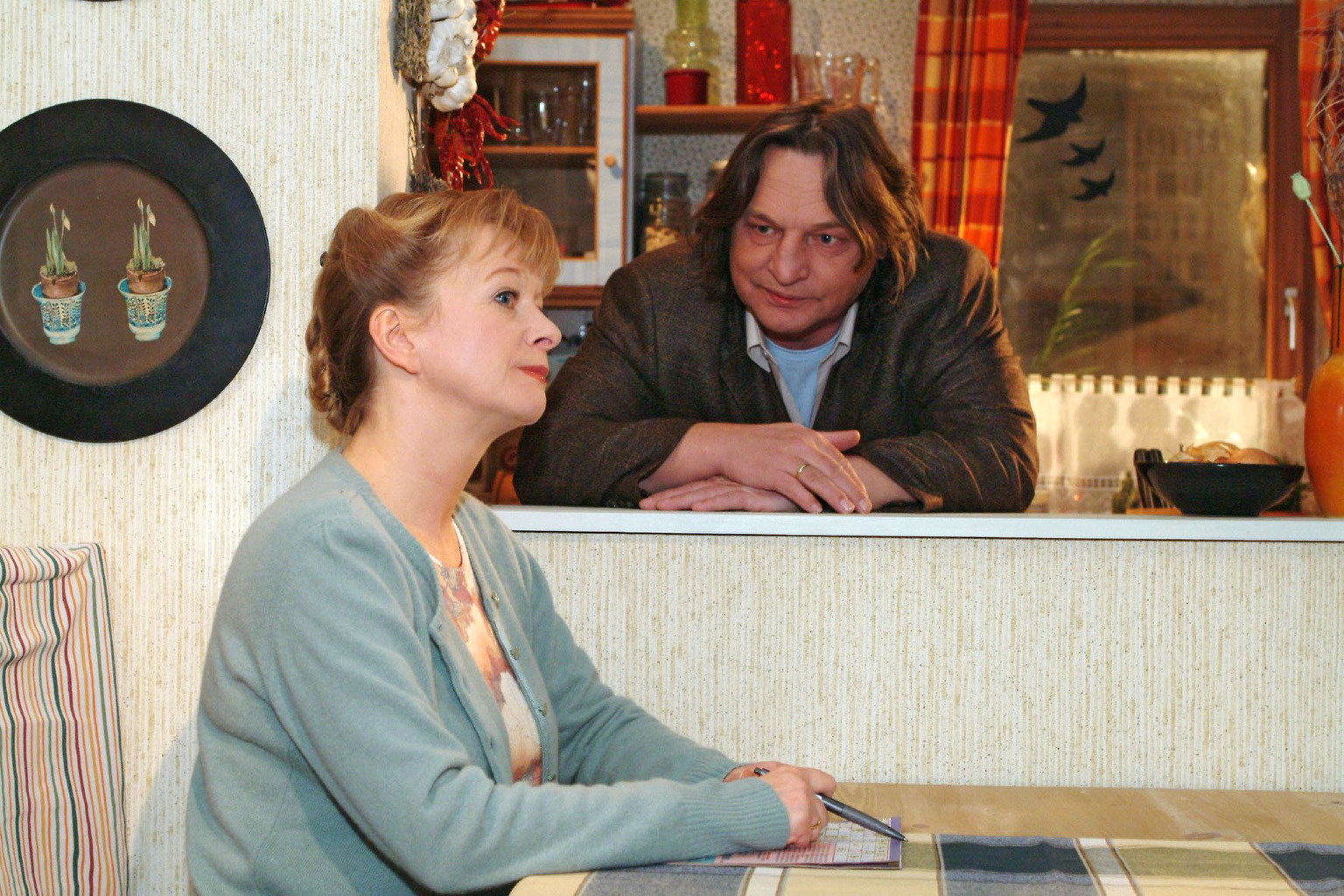 Die AusspracheHugo (Hubertus Regout, r.) kann seine Gefühle für Britta (Susanne Berckhemer, l.) nicht länger verbergen.Bild: © Sat.1 Eigenproduktionsbild frei