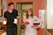 UnterstützungTimo (Matthias Dietrich, l.) gibt vor, Hannah (Laura Osswald, r.) bei der Suche nach einem Nachmieter für Yvonne unterstützen zu wollen - lässt aber kein gutes Haar an den Bewerbern.Bild: © Sat.1 Eigenproduktionsbild frei