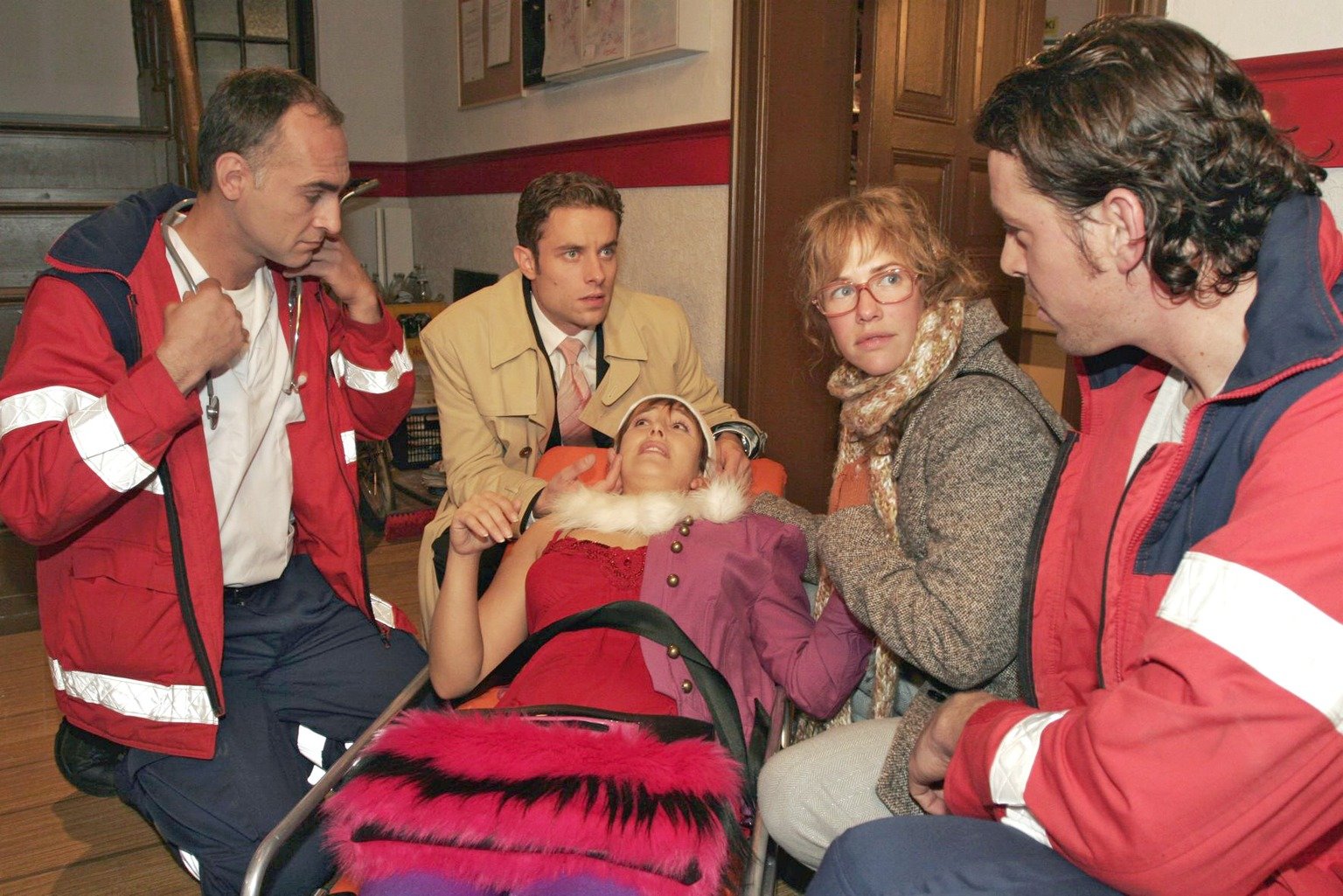 Sorge um YvonneLisa (Alexandra Neldel, 2.v.r.) und Max (Alexander Sternberg, 2.v.l.) machen sich große Sorgen um Yvonne (Bärbel Schleker, M. liegend), die die Treppe heruntergefallen ist. (Dieses Foto von Alexandra Neldel darf nur in Zusammenhang mit der Berichterstattung über die Serie "Verliebt in Berlin" veröffentlicht und verbreitet werden.)Bild: © Sat.1 Eigenproduktionsbild frei