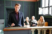 Tiefe GräbenKim ist ebenso überrascht wie erleichtert, dass Paolo sie vor Gericht nicht mit gefälschten Beweisen belastet. v.l.n.r.: Paolo (Thorsten Feller), Kim (Lara-Isabelle Rentinck), Friedrich (Wilhelm Manske), Laura (Olivia Pascal)Bild: © Sat.1 Eigenproduktionsbild frei