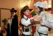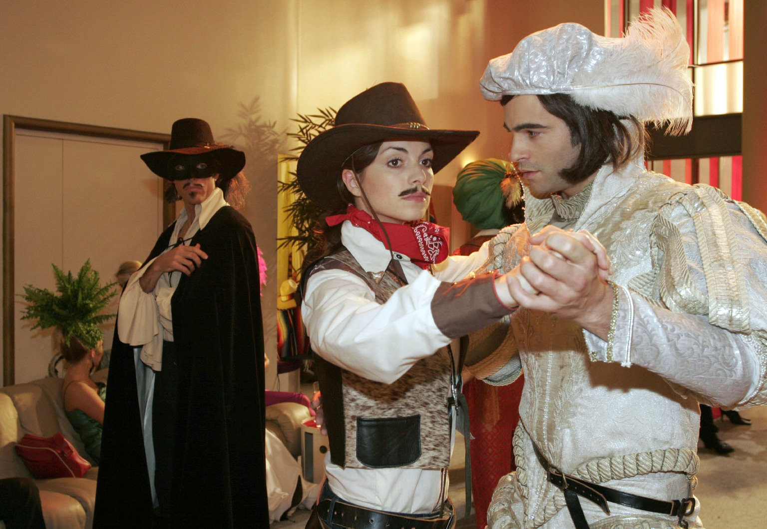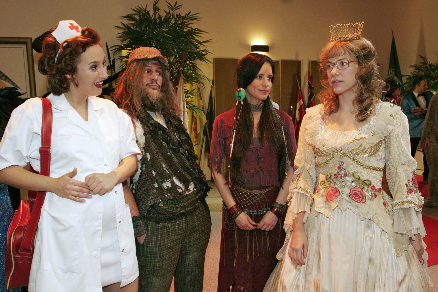 MaskeradeLisa kann sich trotz der vielen Komplimente nicht freuen - und kaum die Augen vom traurigen David abwenden ... v.l.n.r.: "Krankenschwester" Yvonne (Bärbel Schleker), "Tippelbruder" Rokko (Manuel Cortez), "Indianer-Squaw" Inka (Stefanie Höner), "Prinzessin" Lisa (Alexandra Neldel) - (Dieses Foto von Alexandra Neldel darf nur in Zusammenhang mit der Berichterstattung über die Serie "Verliebt in Berlin" veröffentlicht und verbreitet werden.)Bild: © Sat.1 Eigenproduktionsbild frei