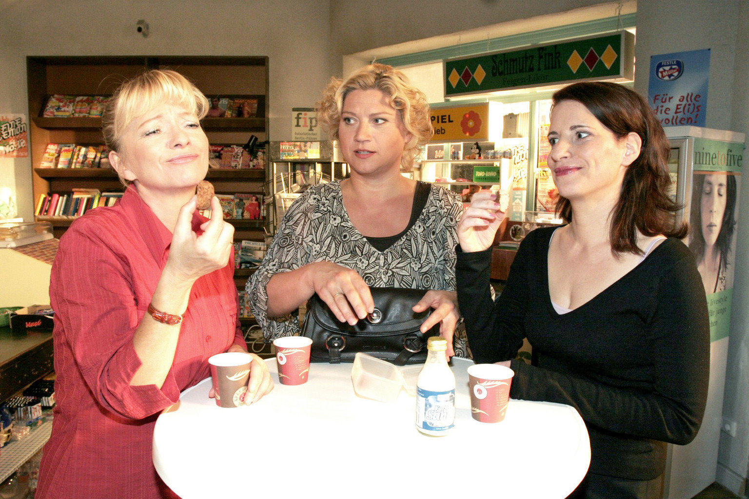 Eigenwillige MethodenAgnes (Susanne Szell, M.) muss sich den Spott von Helga (Ulrike Mai, l.) und Inka (Stefanie Höner, r.) gefallen lassen, als sie von ihrem Abend mit Boris berichtet.Bild: © Sat.1 Eigenproduktionsbild frei