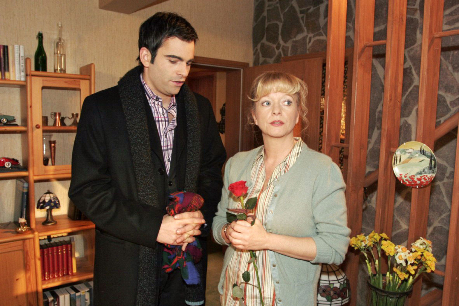 Die EntscheidungHelga (Ulrike Mai, r.) ist irritiert, als David (Mathis Künzler, l.) mit einer roten Rose auftaucht, um Lisa zu besuchen.Bild: © Sat.1