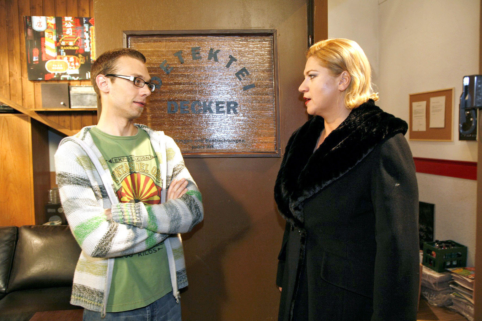 Eine alte BekannteKim (Lara-Isabelle Rentinck, r.) bekommt mit, wie Bruno (Tim Sander, l.) sich am Telefon um einen passenden Ersatz für Nora bemüht.Bild: © Sat.1 Eigenproduktionsbild frei