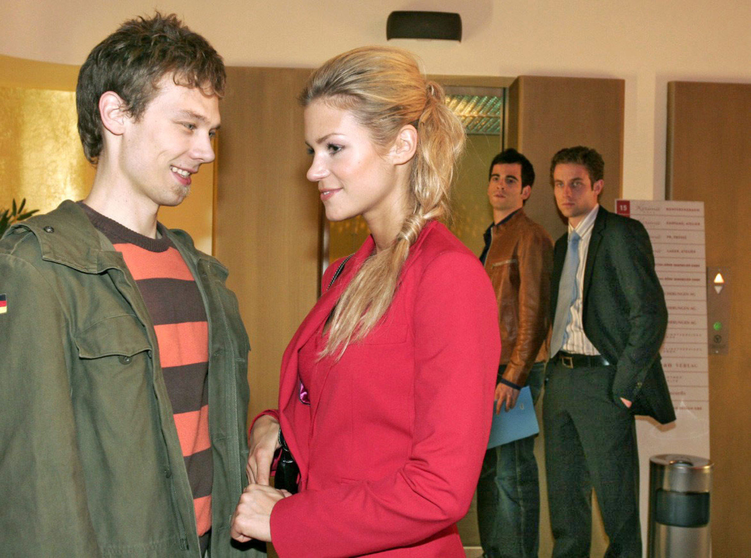 Der VertrauensbruchDavid (Mathis Künzler, 2.v.r.) und Max (Alexander Sternberg, r.) staunen nicht schlecht, als sie Lisas Verlobten Jürgen (Oliver Bokern, l.) vor dem Fahrstuhl bei einer Annäherung an Sabrina (Nina-Friederike Gnädig, 2.v.l.) "ertappen".Bild: © ProSieben Media AG Sat.1