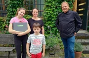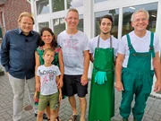 Kochen für die ganze Familie - gesund, günstig und leckerWohin mit den Äpfeln aus dem eigenen Garten? Björn Freitag (l) und Familie Brechmann (2.u.3. v.l. besuchen die Mosterei von Bernardin Schenk (r) und seinem Sohn Tom Schenk (2. v.r.).Bild: © WDR/solisTV
