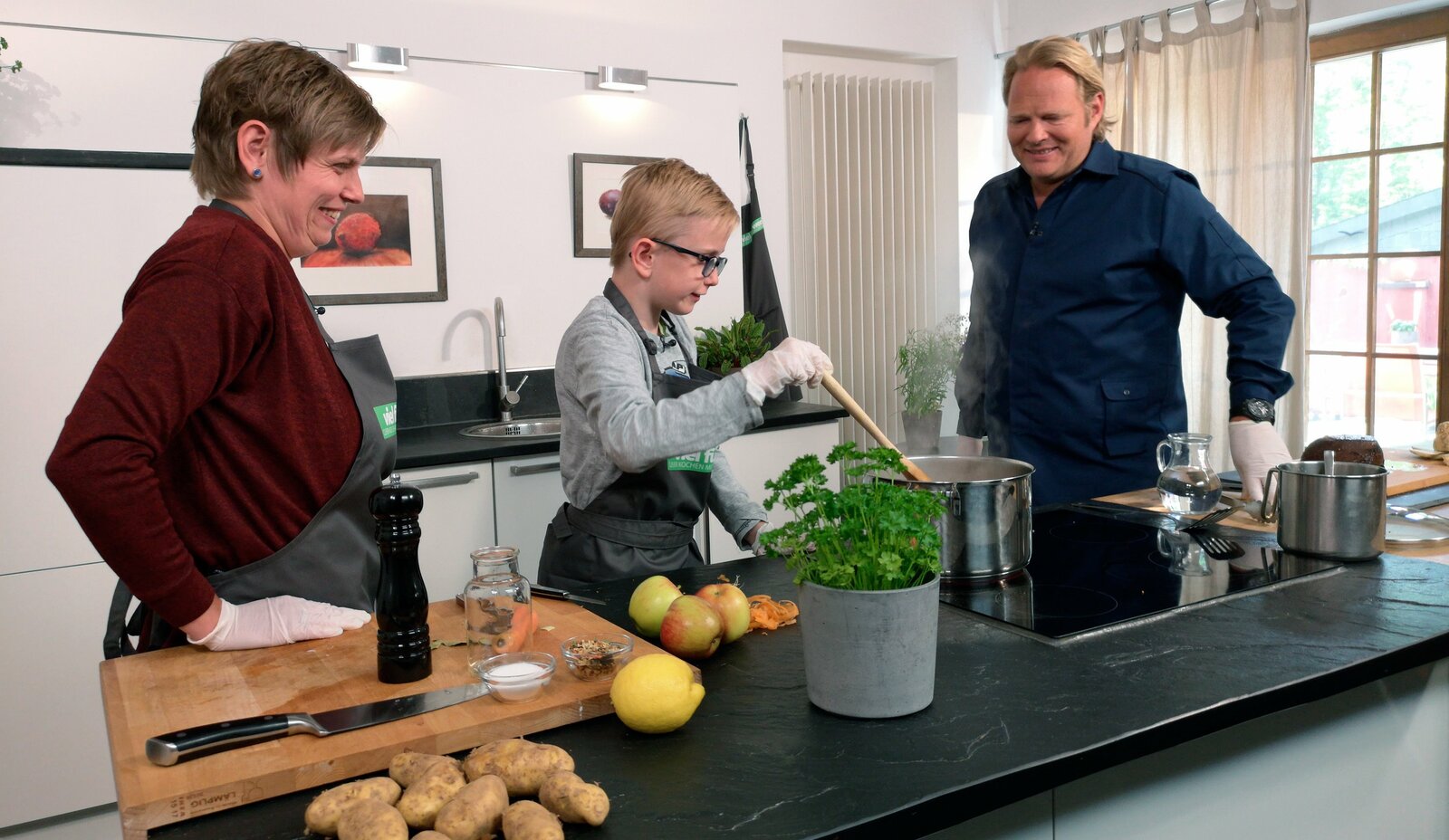 Bestes Fleisch und viel Gemüse - Björn Freitags gesunde FamilienkücheBjörn Freitag (r) zeigt Familie Quabeck einfache Familienrezepte mit gesunden Zutaten.Bild: © WDR/Solis TV/Oliver Herber