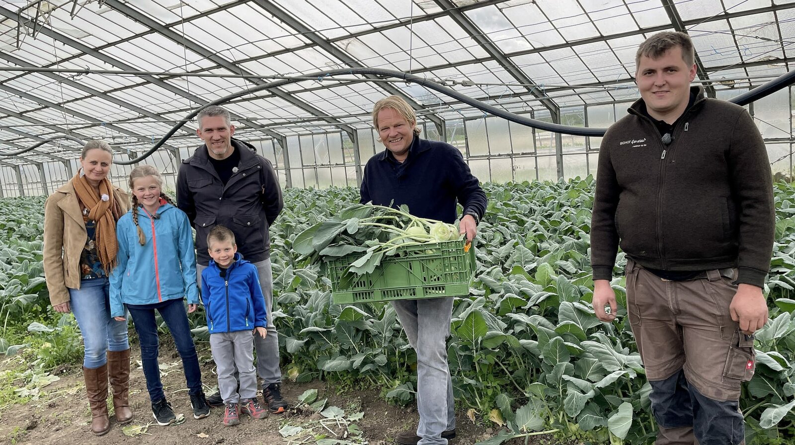 Gemüseküche für alle - bunt, gesund und einfach gutIn einer Bioland Gärtnerei in Nottuln zeigt Björn Freitag (l) Familie Mathioschek, wie regionales Gemüse angebaut wird.Bild: © WDR/solis TV/Oliver Herber