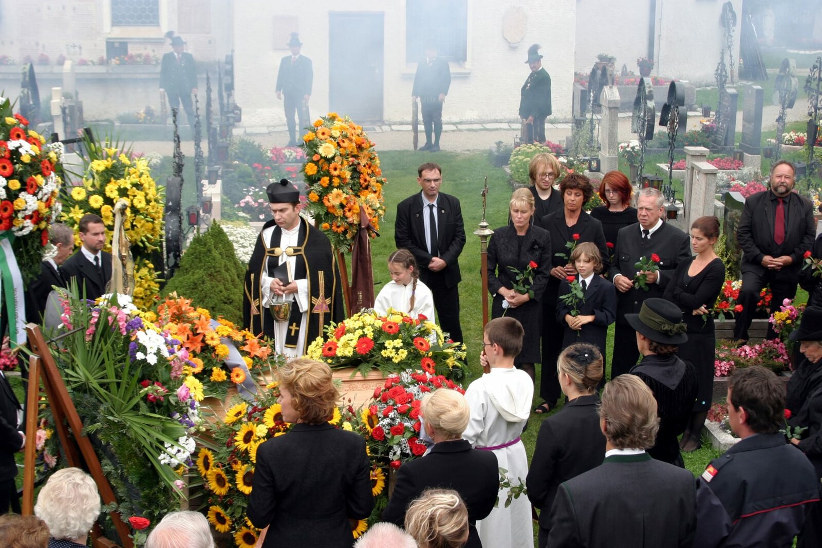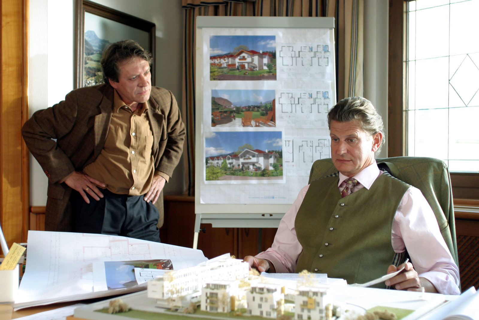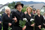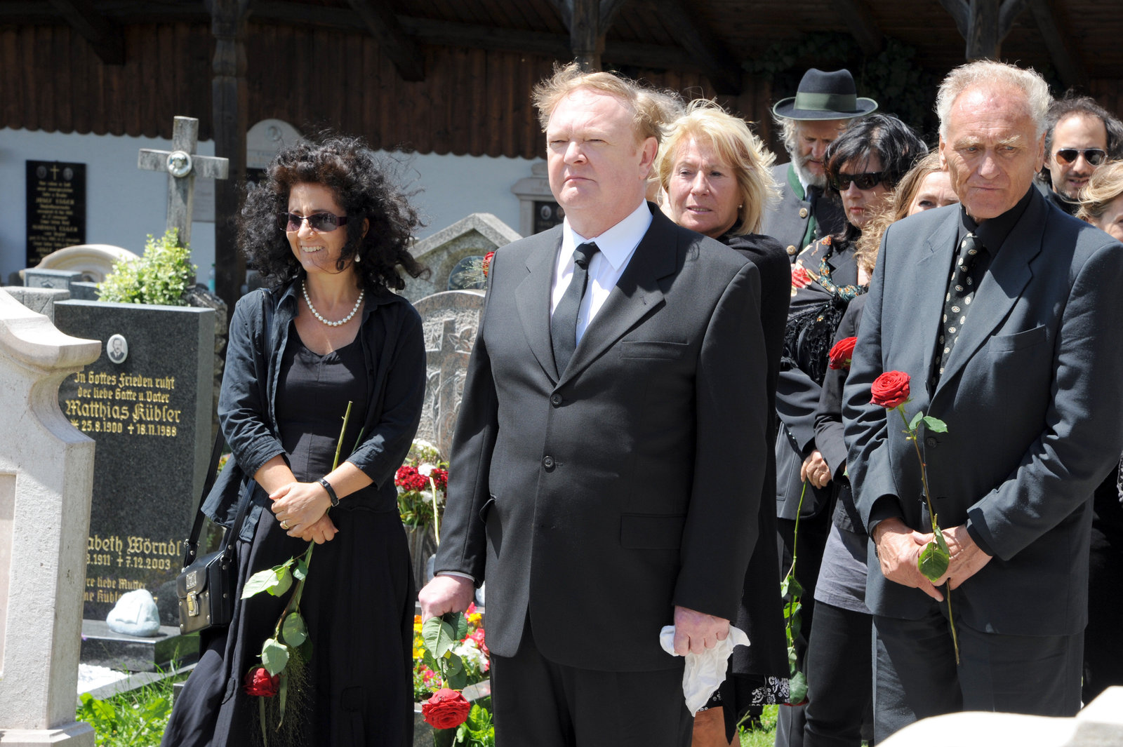 Warm abtragen"Vier Frauen und ein Todesfall", "Warm abtragen." Der alte Gustl Hauser kommt beim Brand seiner Scheune in den Flammen um. Bei seinem Begräbnis kommen sich sein Sohn Josef und dessen Tochter Lucy in die Haare. Lucy wirft ihrem Vater vor, dass er ja seit langer Zeit auf den Tod des Großvaters hofft, damit er endlich den Hof verkaufen kann. Grund genug für die vier "Begräbnis-Freundinnen" Julie, Henriette, Maria und Sabine ihre Ermittlungen aufzunehmen. Verdächtig ist natürlich Josef, den die Eröffnung des Testaments noch tiefer in den Hass gegen seinen verstorbenen Vater treibt.Im Bild (v.li.): Helmut Berger (Josef Hauser), Georges Kern (Bürgermeister).Bild: © ORF III