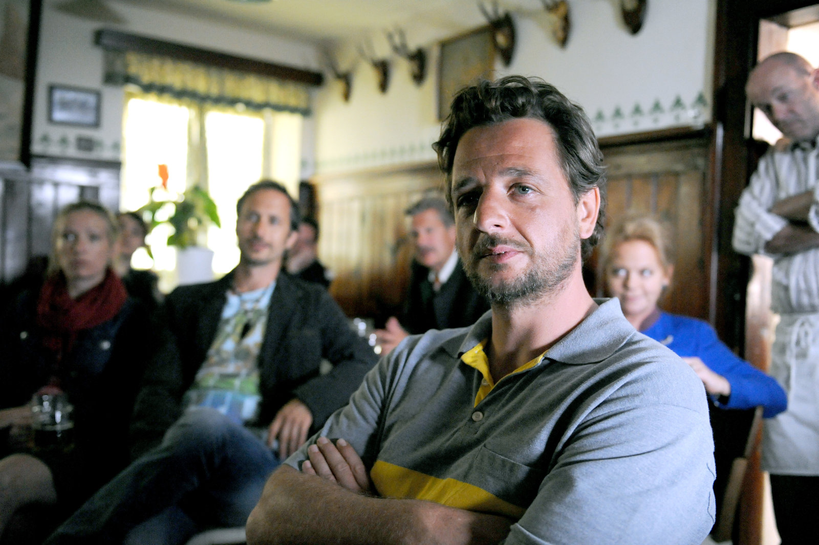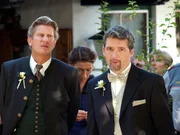 Drachentöter"Vier Frauen und ein Todesfall", "Drachentöter." Hochzeitsfest beim Dorfwirt. Sportausrüstungsfabrikant Urban Stainzer heiratet Francesca, ein bildhübsches Mädchen aus dem Ort. Tommi Engel, der weltberühmte Drachenflugmeister, soll aus der Luft den Brautstrauß zuwerfen. Der gewagte Anflug landet letal im Glockenturm. Die Hochzeitsfeier wird zum Tribunal des Dorfgendarmen Paulmichl, der sich ganz sicher ist, dass Engel nicht von selbst vom Himmel gefallen ist. Alle Anwesenden sind verdächtig und den dilettantischen Verhörmethoden des Gendarmen ausgesetzt. Julie, Henriette, Maria und Sabine können dem Treiben nicht lange zusehen und nehmen die Ermittlungen in die Hand. Rasch finden sie heraus, dass Tommi Engel einige Feinde hatte - und tatsächlich sind sie alle anwesend.Im Bild (v.li.): Georges Kern (Bürgermeister), Harald Posch (Urban Stainzer).Bild: © 3sat