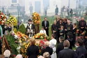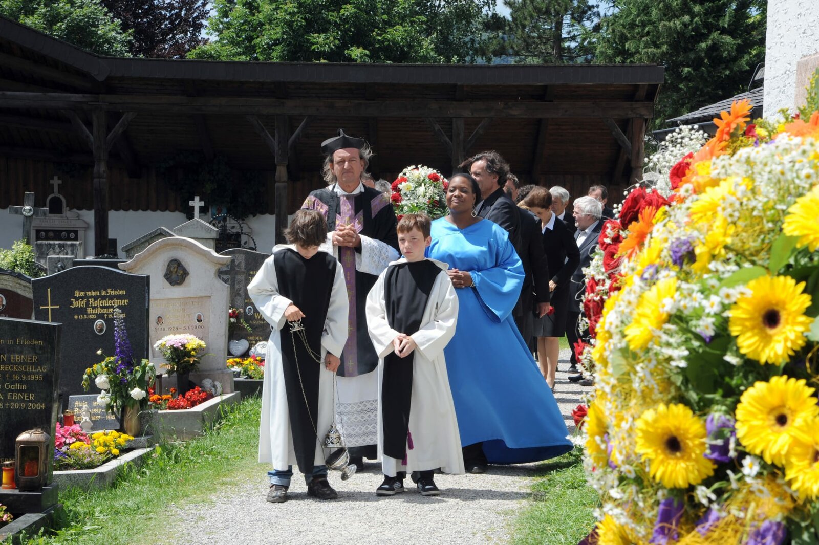 Auferstanden"Vier Frauen und ein Todesfall", "Auferstanden." Während Dorfwirt Salchegger wegen des Seitensprungs mit Gerti Zeilinger und seinen nagenden Schuldgefühlen die Proben zu den Ilmer Passionsspielen fast unmöglich macht, beginnt Franzi ein Resozialisierungssprojekt namens "The Jailhouse" für ehemalige Häftlinge. Doch das ist alles erst der Anfang. Denn als Gerti tags darauf leblos in ihrer Wohnung aufgefunden wird, Salcheggers Frau Maria angblich kurz davor bei ihr war und kein schlüssiges Alibi vorweisen kann, tritt der forsche Kripobeamte Köhlmeier auf den Plan. Und dann erlebt Dorf Ilm beim Begräbnis der Gerti Zeilinger etwas selbst hier noch nie Dagewesenes.Im Bild (v.li.): Markus Linder (Pfarrer Anton Prinz), Gail Anderson (Mahalia Preston).Bild: © ORF/Hubert Mican