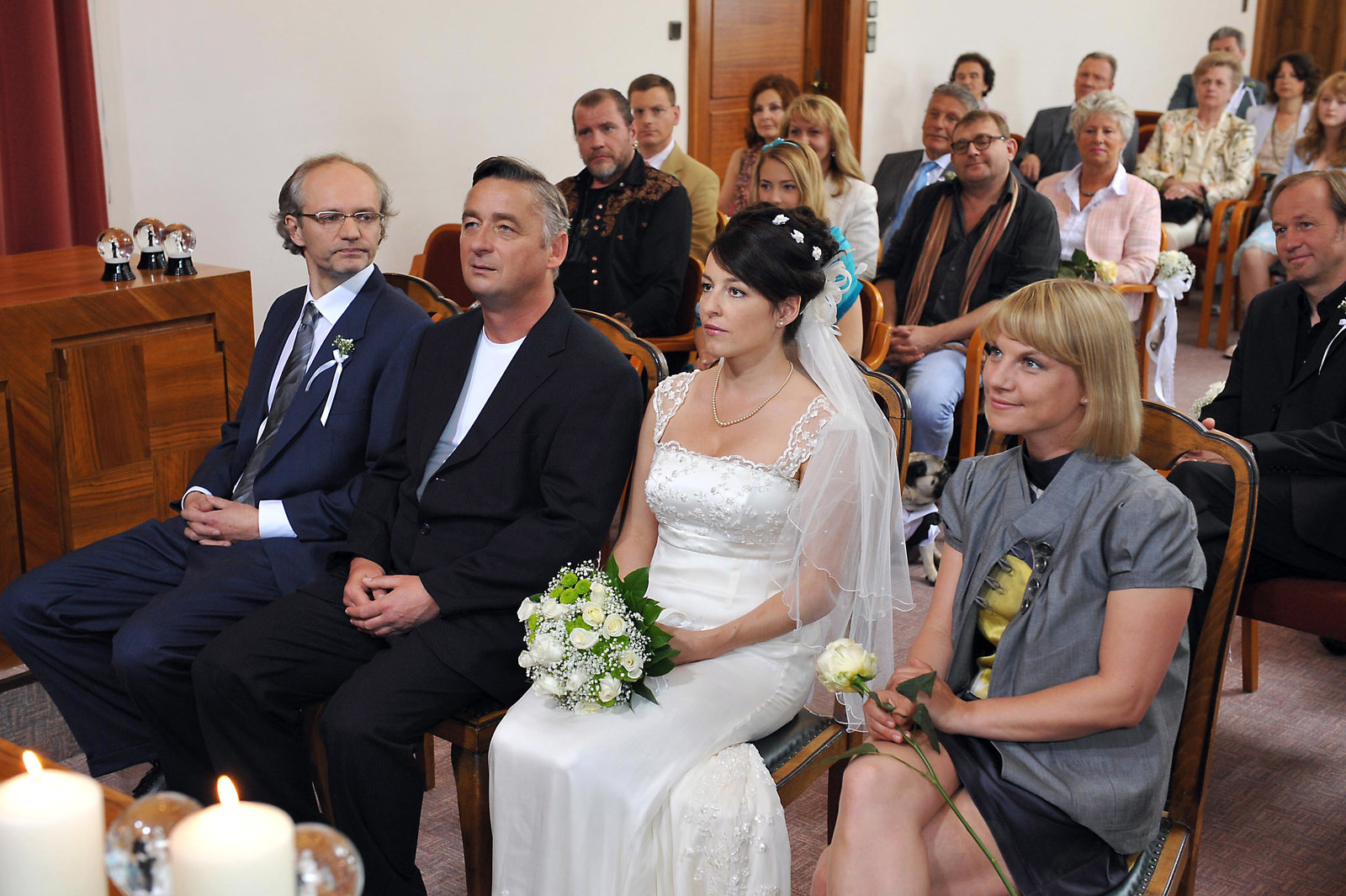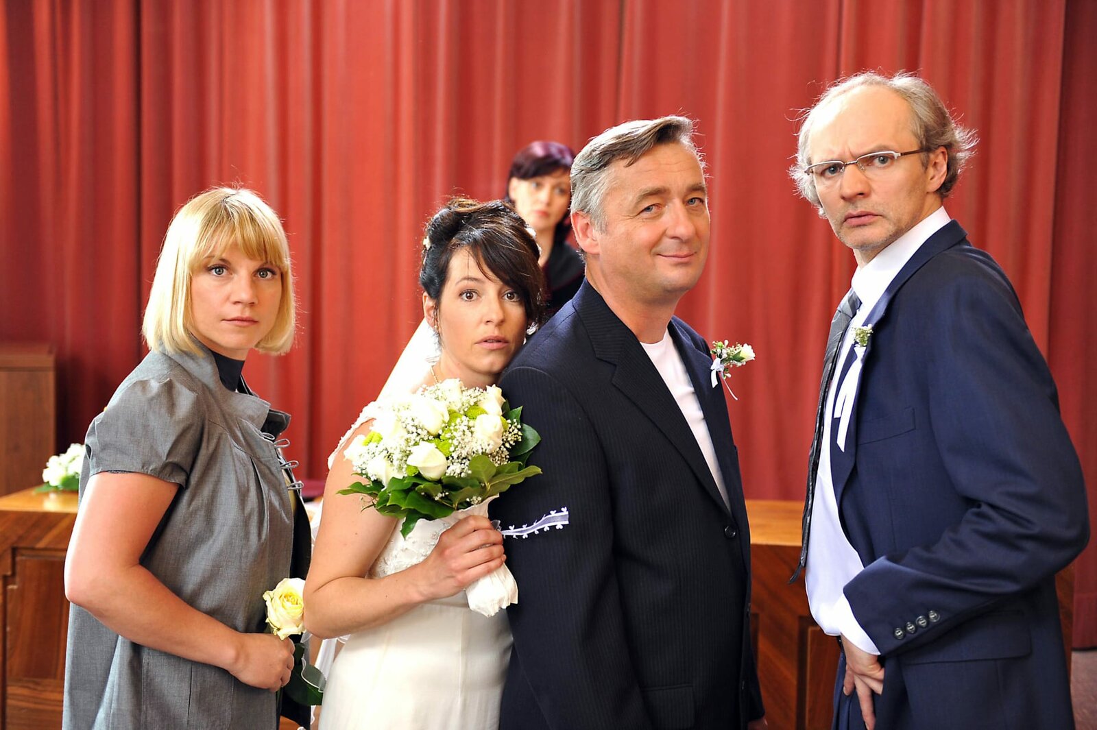 Die Filzlaus"VITÁSEK?", "Die Filzlaus." Beim Casting zur neuen Serie trifft Vitásek auf Speedy, einen Kollegen aus rebellischen Jugendtagen. Beim Abendessen im trauten Heim erzählt Speedy zur Unterhaltung von Valerie und Andis Tochter peinliche alte Geschichten von ihm und Andi. Wegen der alten Zeiten legt Vitásek für seinen Jugendfreund ein gutes Wort ein und dieser wird engagiert. Aber am ersten Drehtag taucht Speedy nicht auf. Die Dreharbeiten scheinen plötzlich gefährdet. Doch bis zur Hochzeit ist dann alles wieder im Lot.Im Bild (v.li.): Kristina Sprenger (Kristina), Julia Cencig (Valerie), Brigitte Soucek (Standesbeamtin), Andreas Vitásek (Andreas Vitásek), Günther Franzmeier (Georg "Schurli" Heinzl).Bild: © ORF/Hubert Mican