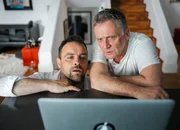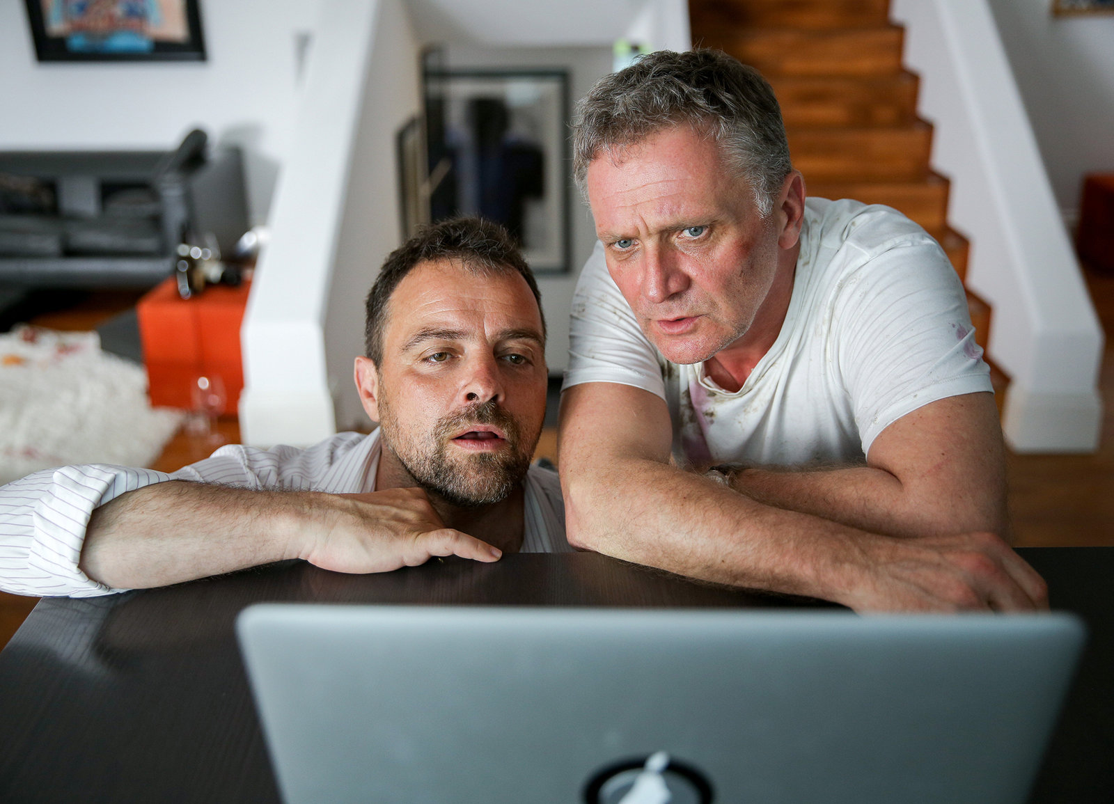 GemeinheitenEntdecken Erstaunliches auf dem PC: Jürgen Maurer als Georg Schneider, Bernhard Schir als Hadrian MelzerBild: © SRF/ORF/MR Film/Petro Domenigg