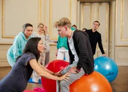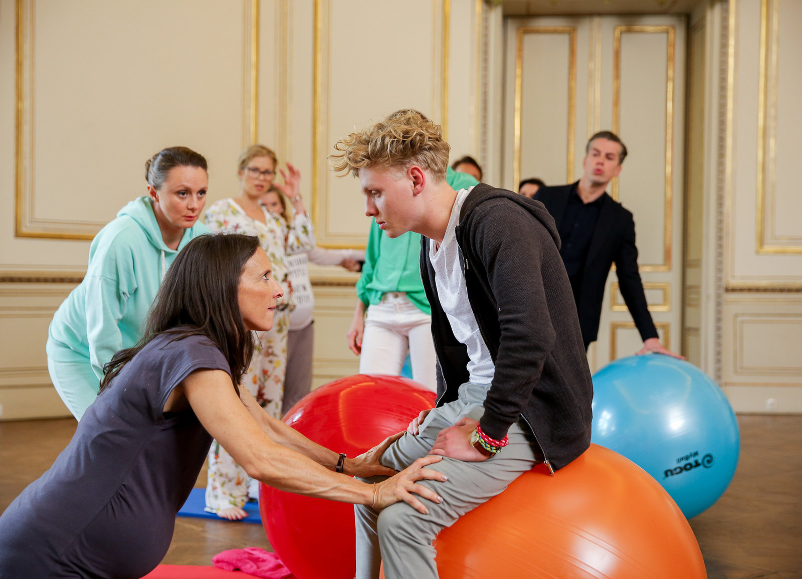 GemeinheitenIm Schwangerschaftsturnen: Gerti Drassl als Maria Schneider, Maria Köstlinger als Waltraud Steinberg, Johannes Nussbaum als Simon SchneiderBild: © SRF/ORF/MR Film/Petro Domenigg