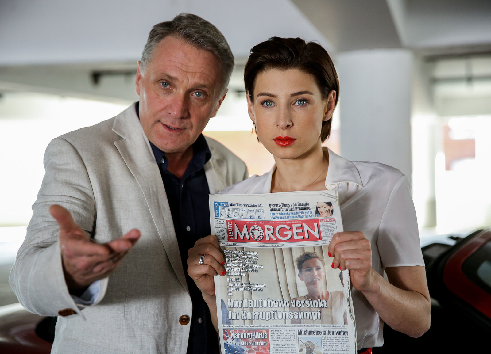 HeimlichkeitenLautstarke Diskussionen im Parkhaus: Gerti Drassl als Maria Schneider; Adina Vetter als Sabine Herold; Juergen Maurer als Georg Schneider; Lucas Gregorowicz als Bertram Seli; Bernhard Schir als Hadrian Melzer; Martina Ebm als Caroline MelzerBild: © SRF/ORF/MR Film/Petro Domenigg