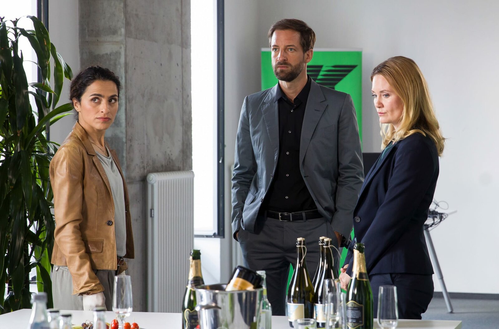 Die 23 mit KorianderApathisch schaut Nicole Deetmers (Pauline Knof, r.) ins Leere, während ihr Chef Phil Koslowski (Dominik Maringer, M.) von Jasmin Sayed (Sesede Terziyan, l.), vom Tod seines Kompagnons erfährt.Bild: © ARD/Daniela Incoronato / ARD-Programmdirektion