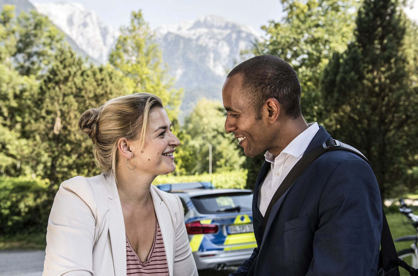 Der Alte vom BergJohanna Beissl (Ines Lutz, l.) und Jerry Paulsen (Peter Marton, r.) verabschieden sich vor dem Polizeirevier.Bild: © "Bild: ARD/Susanne Bernhard (S2). ARD-Programmdirektion/Bildredaktion