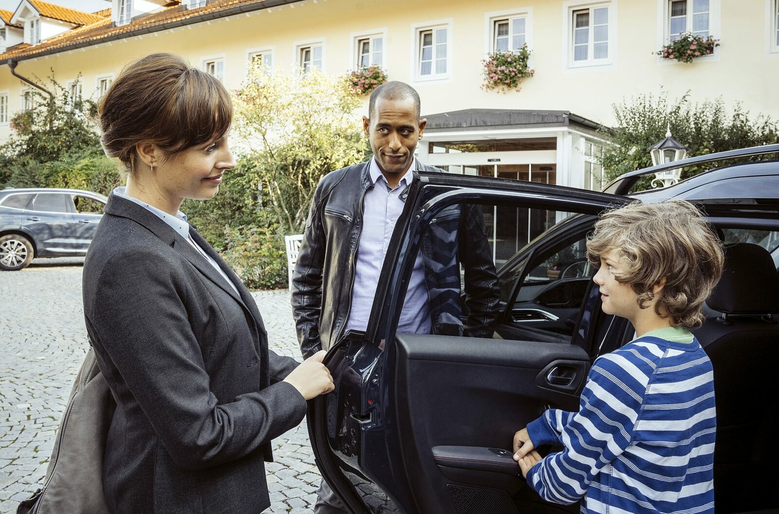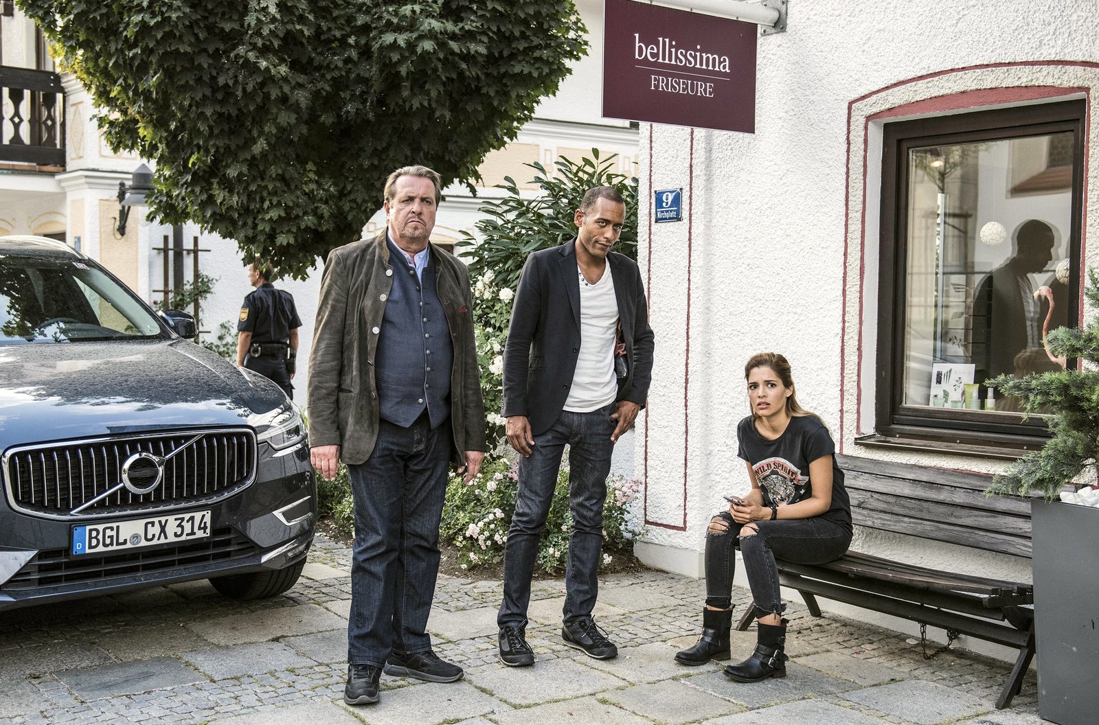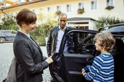 InkognitoJerry Paulsen (Peter Marton, M.) spricht vor dem Gasthof zur Post mit Felicitas Beck (Dagny Dewath, l.) während ihr Sohn Florian (Anton Unertl, r.) in den Wagen steigt.Bild: © SWR/ARD/Hendrik Heiden